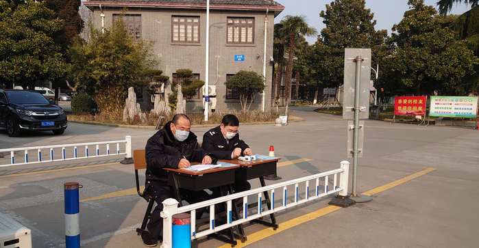 疫情防控期间,保卫处严格执行处领导带班值守制,以上率下、率先垂范,全体党员干部冲锋在前、义无反顾,全体校卫队员以防疫大局为重,默默奉献,无一人退缩,无一人脱岗,持续执行“五加二”“白加黑”疫情防控制度,校卫队队长、副队长,坚守防控一线,每天坚持到各校区检查人员在位、措施落实情况,指导门卫开展疫情防控工作,及时上报校卫队人员流动、在岗及异常情况。根据《疫情防控工作方案》,校卫队下发“关于疫情防控”期间相关工作要求,加强门卫管理,严格控制外来人员及车辆进入学校。对所有进入校园的职工进行体温检测,登记,劝阻外来人员不要进入校园。特别是部分校内职工,由于封闭部分大门,给他们进入校园带来不便,对于他们的不理解不配合,校卫队员耐心做工作,承受委屈,但他们毫无怨言,仍然坚持原则、一丝不苟,认真做好门卫管理工作。部分队员表示国家有难,匹夫有责,再苦再难,也要完成疫情防控任务,报答学校关怀。南校区校卫队队员杨波,家里亲戚病故,为了不影响正常工作,强忍悲痛,坚守工作岗位。东校区巡逻班长杨军,主动放弃双休日,坚持每天带班工作。西校区校卫队分队长丁跃生同志,2月份即将退休,但该同志坚守岗位,坚持站好最后一班岗。三校区巡逻队员在保持校园正常巡逻状态下,间隔时间加强门卫管理。