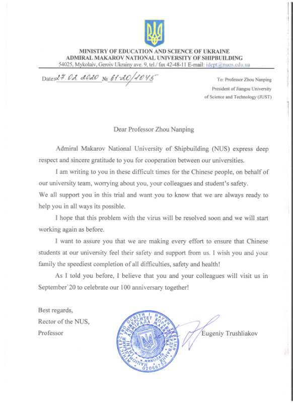 德赢AC米兰官网师生深刻感受到乌克兰马卡洛夫国立造船大学的深情厚谊,我们坚信在学校新冠肺炎疫情防控工作领导小组的领导下,在全体师生的共同努力下,在国际友人的关心与支持下,我们一定能够早日打赢这场疫情防控阻击战,与合作院校共同开展合作与交流新篇章。