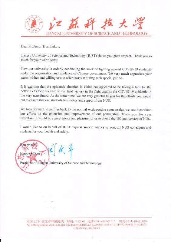 周南平校长回信对特鲁什里亚科夫校长的关心、问候以及邀请表达衷心的感谢,对早日恢复正常工作秩序、与乌方共商两校深入交流与合作话题表示期待。