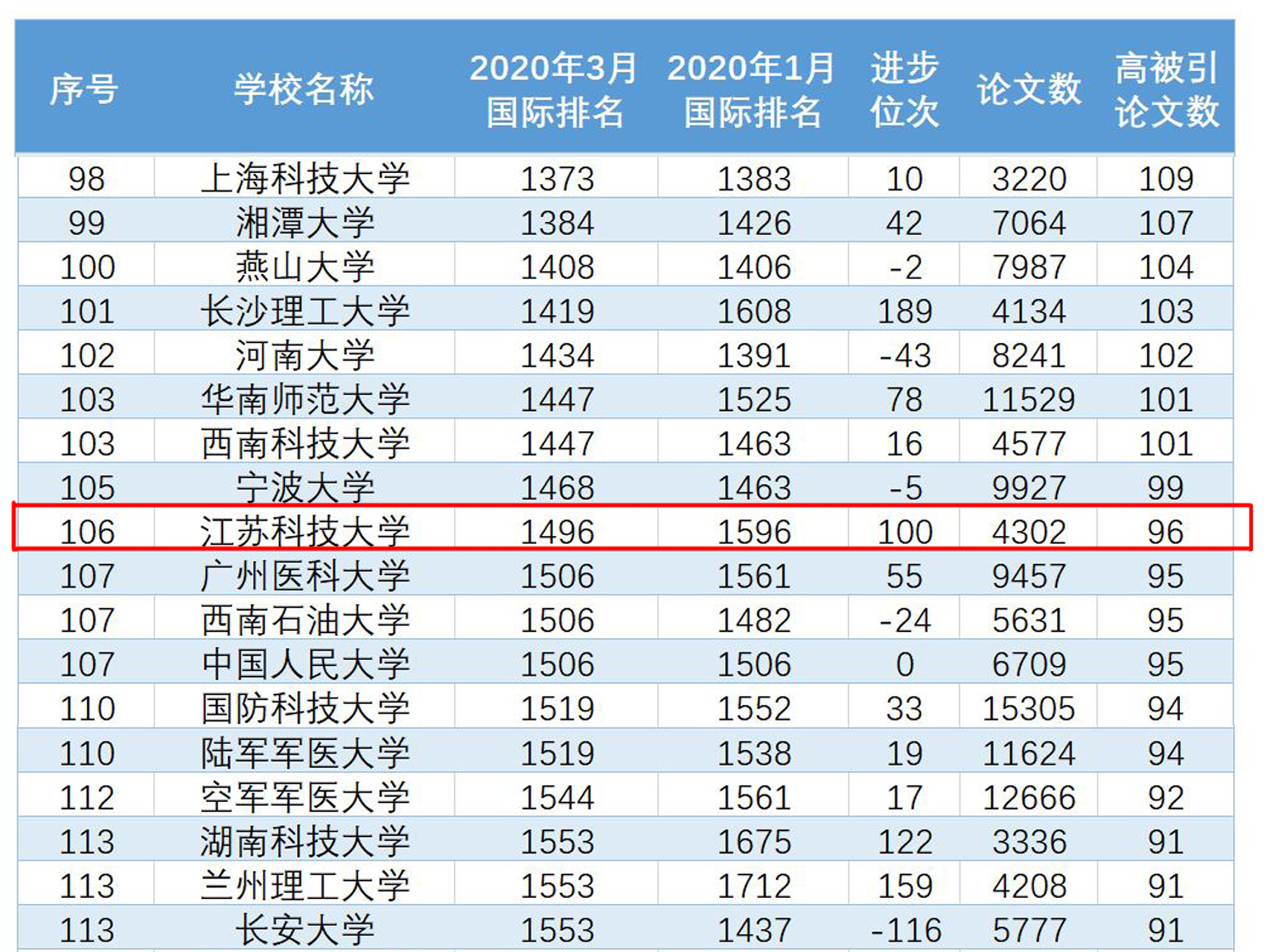 5月7日,爱思唯尔正式发布了2019年中国高被引学者(Chinese Most Cited Researchers)榜单,本期中国大陆拥有高被引论文的高校共288所,江科大位列中国大陆高校“ESI高被引论文数量”排行榜106位,学校整体国际排名较上期提升100名,学科排名提升工作成绩斐然。