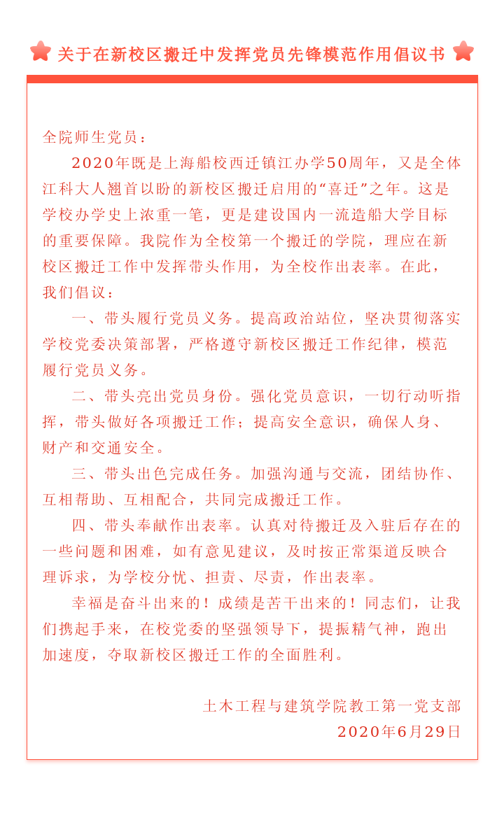 “带头履行党员义务,带头亮出党员身份,带头出色完成任务,带头奉献作出表率”……早在6月24日,土建学院教工第一党支部就在全院发起《关于在新校区搬迁中发挥党员先锋模范作用倡议书》,希望全体党员做到“四个带头”,充分发扬先锋模范作用。刘清生告诉记者,“关键时刻,每一位党员都要发挥好带头作用,要有不怕苦不怕累的奉献精神,要精诚团结、共同协作,相互提醒、守望相助,全力以赴做好新校区搬迁工作”。在大家的共同努力下,搬迁工作第一天就超额完成当天搬迁任务。