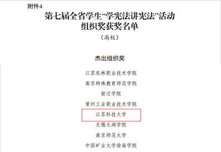 近日,省教育厅公布了第七届全省学生“学宪法讲宪法”活动评选结果(苏教法函〔2022〕11号),德赢官网荣获高校组“杰出组织奖”。全省共35个单位(7个教育局、14所本科、14所高职高专院校)获“杰出组织奖”。