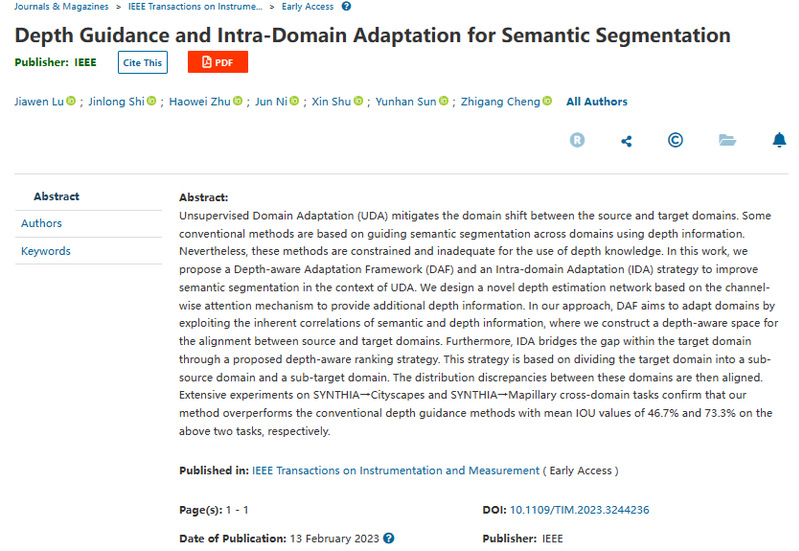 近日,德赢官网计算机学院2020级硕士研究生卢加文为第一作者,史金龙教授为通讯作者,在计算机仪器仪表学TOP期刊IEEE TRANSACTIONS ON INSTRUMENTATION AND MEASUREMENT上发表了题为“Depth Guidance and Intra-Domain Adaptation for Semantic Segmentation”的高水平学术论文。