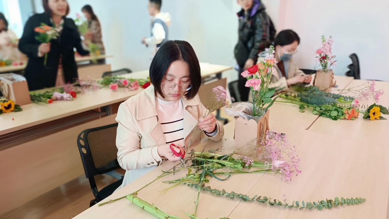 活动开始前,现场工作人员将鲜花、花篮、剪刀、模具、一次性手套等工具提前放置在桌上。老师们入座后,主持人致开场词并介绍活动流程。在插花过程中,老师们各具匠心,巧妙构思,美丽的鲜花经过她们的修剪搭配,突出了花朵亭亭玉立、飞舞横斜的雅斜姿态。错落有致的搭配,形成“特殊”的节日礼物。在制作冷制蚕丝手工皂时,老师们更是别出心裁,用四种颜料调配出紫色并在皂中冷制成满天星花朵。