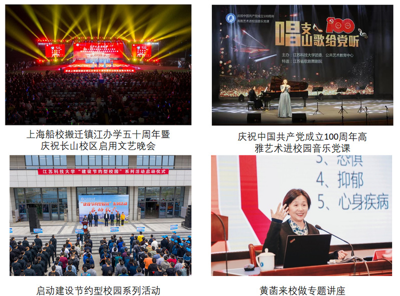 大力弘扬“江海襟怀 同舟共济 扬帆致远”的“船魂”精神,不断提升“船魂”精神凝聚力。举办“我和我的祖国”“永远跟党走,唱响科大梦”师生大合唱、上海船校搬迁镇江办学50周年文艺晚会、节约型校园建设等活动,不断增强广大干部师生员工对学校文化的认同感和归属感,激发广大师生为建设“国内一流造船大学”做出新贡献。