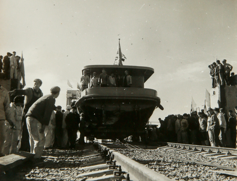 1977年,学校附属船厂千吨轮“鲁烟油2号”下水(左四彭士禄院士,左三刘东明书记)