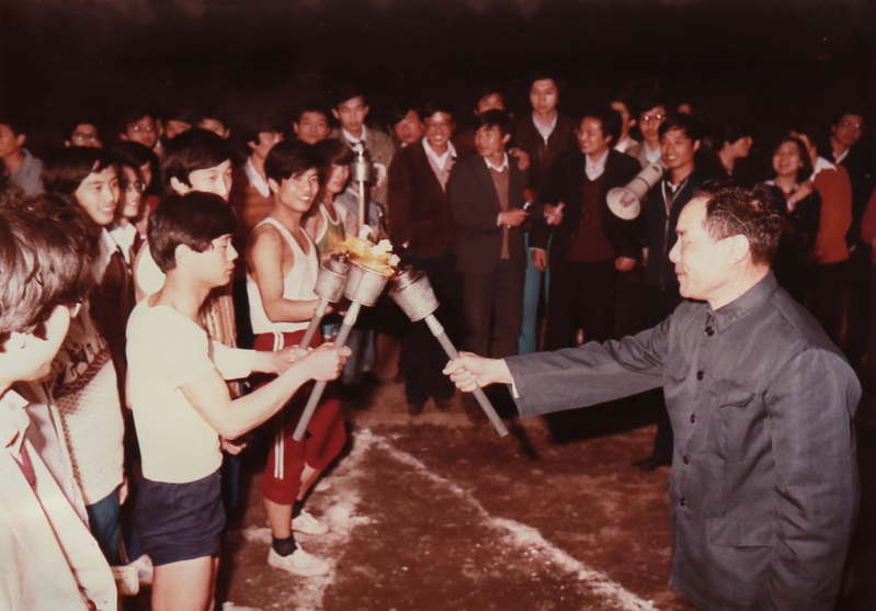 1987年,纪念“五四”火炬接力赛前,学校党委书记杜义龙同志点燃火炬