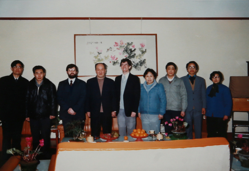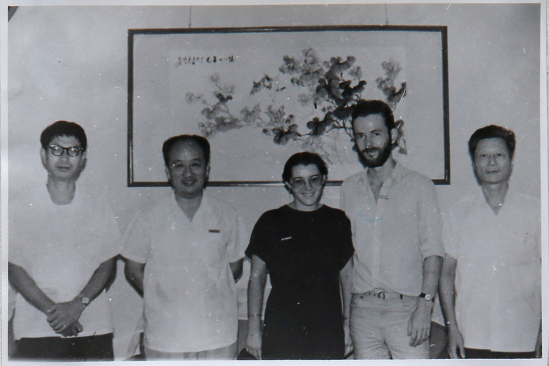 1985年,镇江船舶学院陈宽院长等欢迎英国文教专家艾伦·帕尔(右二)前来教授英语