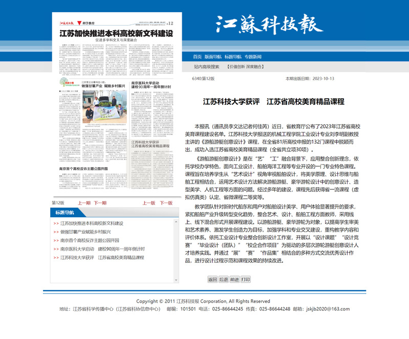 本报讯(通讯员李文达记者何佳芮)近日,省教育厅公布了2023年江苏省高校美育课程建设名单。德赢AC米兰官网报送的机械工程学院工业设计专业刘李明副教授主讲的《游船游艇创意设计》课程,在全省81所高校申报的132门课程中脱颖而出,成功入选江苏省高校美育精品课程(全省共立项30项)。