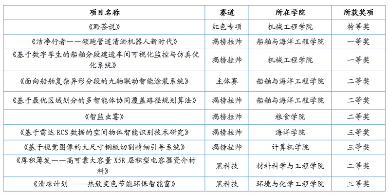 德赢官网于2022年7月启动本届竞赛的备赛工作。在学校党政领导与支持下,校团委与各学院联动,全校师生积极参与项目选拔推荐;校团委发挥团组织服务力、保障力,从赛事伊始,围绕项目培育提升、材料完善细化、后勤服务保障,为参赛师生提供全方位支持和指导。校内选拔赛参赛作品涵盖机械控制、信息技术、能源化工、生命科学以及哲学社会科学类社会调查报告等诸多领域。在“红色专项活动”中,机械工程学院项目《黔茶说》获国赛特等奖。在“揭榜挂帅”专项赛中,船舶与海洋工程学院项目《洁净行者——领跑管道清淤机器人新时代》和机械工程学院项目《基于数字孪生的船舶分段建造车间可视化监控与仿真优化系统》获国赛一等奖,船舶与海洋工程学院项目《基于最优区域划分的多智能体协同覆盖路径规划算法》、粮食学院项目《智监虫霉》获国赛二等奖,计算机学院项目《基于视觉图像的大尺寸钢板切割精细引导系统》和海洋学院项目《基于雷达RCS数据的空间物体智能识别技术研究》获国赛三等奖。在主体赛中,船舶与海洋工程学院项目《面向船舶复杂异形分段的九轴联动智能涂装系统》获国赛二等奖。在“黑科技”专项赛中,材料科学与工程学院项目《厚积薄发——高可靠大容量X5R层积型电容器瓷介材料》获国赛二等奖,环境与化学工程学院项目《清凉计划——热致变色节能环保智能窗》获国赛三等奖。