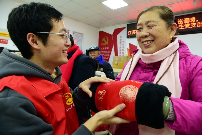 12月6日上午9:00,工业设计学生党员志愿者在社区干部的引导下,胸前佩戴“党徽”,身穿“红色马甲”,给每位到来的老人分发围巾和暖手袋,同时用温暖话语带去关怀与温情。一条条精致的围巾围在老人脖颈上,希望他们在这个寒冷的冬季,带上志愿者们那份火热的心意和祝福,迎接新的一年。除了送去保暖用品之外,党员志愿者们也与老人们交流谈心,详细地询问身体和家庭情况,并叮嘱他们适时添衣加被,注意防寒。 “谢谢,真的谢谢你们!我感受到了党组织对我们普通百姓的关心与问候,这保暖物资里面蕴含了十分浓厚的关怀,让我心里倍感温暖、亲切!”现场的一位老人激动地对志愿者说道。看着老人们脸上洋溢的笑容,学生党员们纷纷表示今后将继续弘扬党的光荣传统和优良作风,践行党的初心使命、根本宗旨,关心关注涉及人民群众切身利益的问题,用心用情解决百姓的困难事。