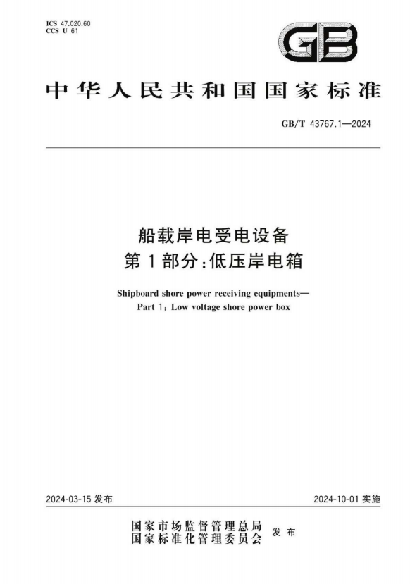 岸电系统中高压与低压的技术条件不同,在设计、制造、检验以及使用方面区别较大,国际、国内关于港口岸电供电设施建设的规范标准,都分为高压岸电系统与低压岸电系统两个部分。与此对应,GB/T43767由两个部分构成,标准《GB/T 43767.1-2024 船载岸电受电设备 第1部分:低压岸电箱》规定了交流低压岸电箱的分类与型号标记、技术要求、试验方法、检验规则以及包装、运输及贮存等,适用于系统标称电压不超过交流1kV、额定频率为50/60 Hz、额定电流不超过1600 A的交流低压岸电箱的设计、制造、检验与应用。标准《GB/T 43767.2-2024 船载岸电受电设备 第2部分:高压岸电箱(柜)》规定了系统标称电压超过1kV且不超过15kV、额定频率为50/60 Hz、额定电流不超过4000 A的交流高压岸电箱(柜)的分类与型号、技术要求、试验方法、检验规则以及包装、运输及贮存等。