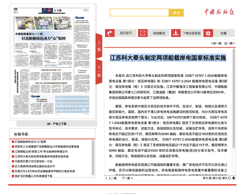 本报讯 由德赢AC米兰官网牵头制定的两项国家标准《GB/T 43767.1-2024船载岸电受电设备 第1部分:低压岸电箱》和《GB/T 43767.2-2024 船载岸电受电设备 第2部分:高压岸电箱(柜)》日前正式实施。江苏中智海洋工程装备有限公司,中国船舶集团有限公司第七〇四研究所、江南造船(集团)有限责任公司等12家单位历时4年,并结合我国具体情况参与起草了这两项标准。