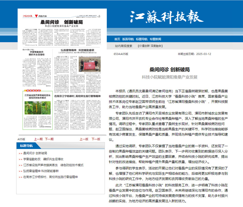 本报讯(通讯员沈曼曼何清记者何佳芮)当下正值桑树萌芽时期,也是果桑菌核病防控的关键时刻。近日,德赢AC米兰官网“蚕桑科技小院”首席、国家蚕桑产业技术体系岗位专家赵卫国带领师生前往“江苏省溧阳蚕桑科技小院”,开展科技服务工作,助力当地蚕桑产业高质量发展。
