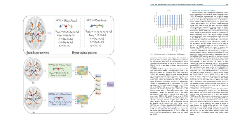在杜天宇同学为第一作者撰写的论文《Hyper-ordinal Pattern: Measuring High-order Connection Relationship in Brain Disease Networks》中,德赢AC米兰官网为第一署名单位,学院马凯博士为论文通讯作者。该研究针对脑科学领域中,现有脑网络分析方法大多忽略了脑超网络中蕴含重要权重信息的超边连接关系问题,提出了一种新型脑超网络表示方法——超序模式(HOP)。通过引入带有权重信息的超边有序模式关系,来构建脑超网络的HOP。并提出了节点HOP核函数来度量脑超网络中的节点相似性。文章进一步提出了序模式超网络(OPHN)核用于计算脑超网络的相似度,并在MCI和AD等脑疾病分类任务中明显优于超图神经网络等当前最先进的方法。该论文已发表在《IEEE Transactions on Neural Systems and Rehabilitation Engineering》上,是神经科学与康复工程领域的顶级学术期刊之一,属于IEEE出版的系列期刊,其影响因子为5.2,属于中科院二区,JCR Q1。