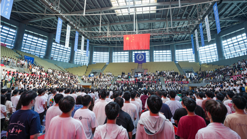 典礼在庄严的国歌声中拉开帷幕,全场师生肃立齐唱,会场气氛正式而热烈,新生们目光坚定,展现出昂扬的精神风貌。