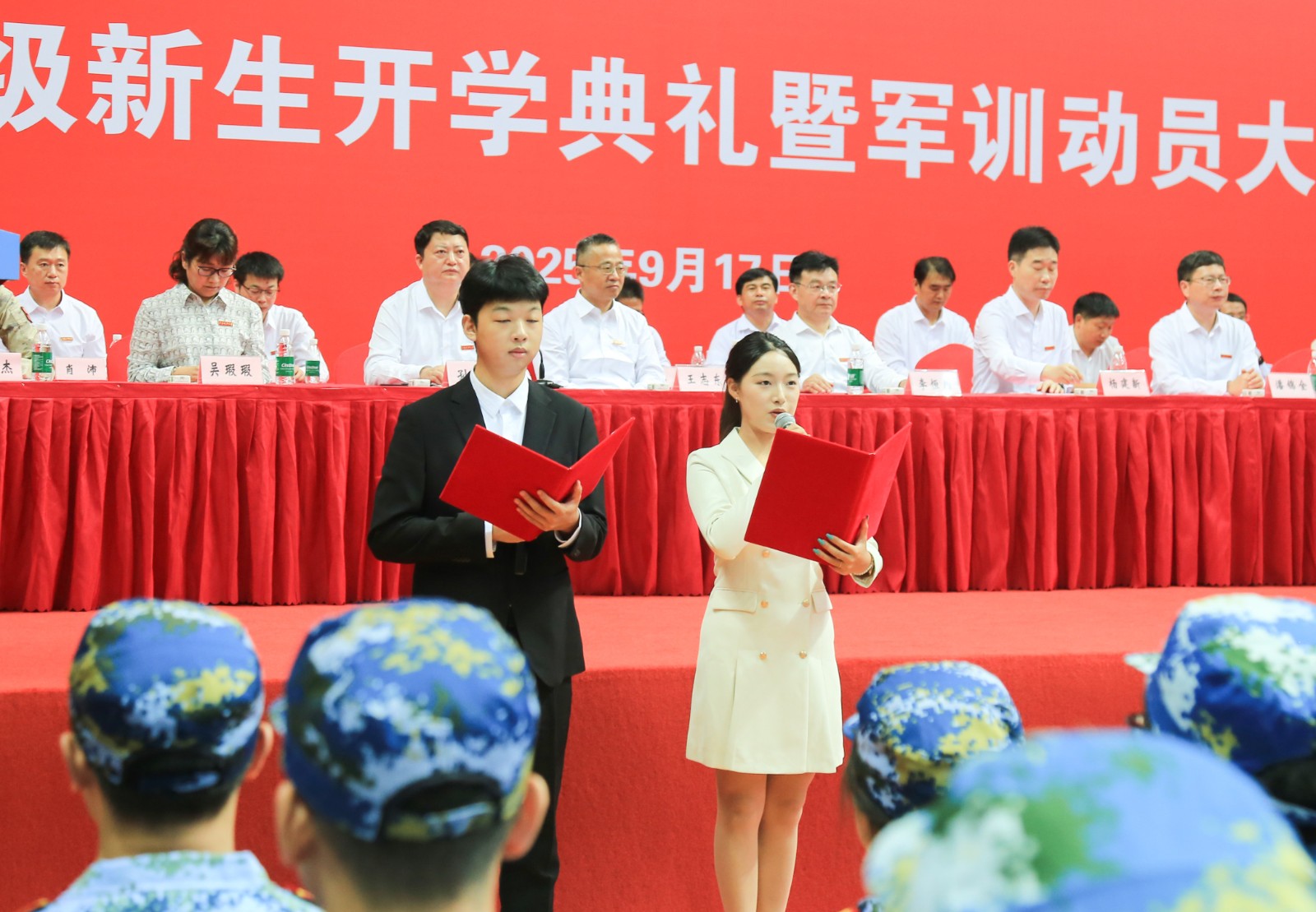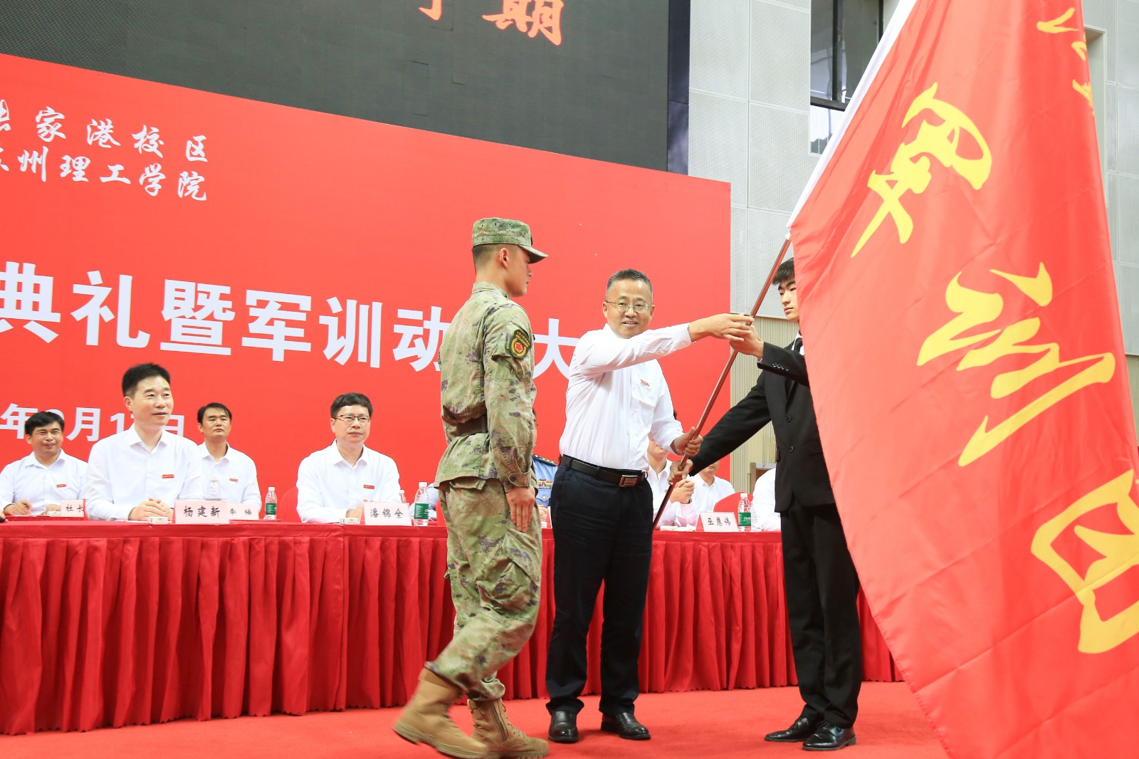 在全场热切瞩目中,杨建新、潘锦全、李恒川为2025级新生代表颁授校徽,王志东为军训独立团授旗。