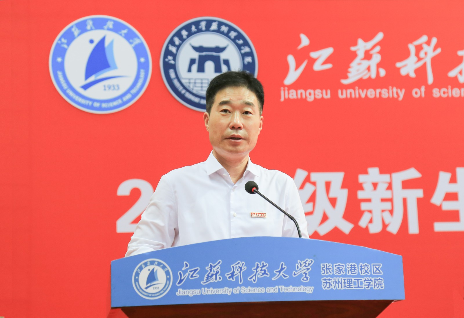 典礼在庄严的国歌声中拉开帷幕。杨建新以《扬帆逐梦,青春远航》为题,为全体新生讲授开学第一课。他指出,一代代江科大人秉承“笃学明德,经世致用”的校训,传承“江海襟怀、同舟共济、扬帆致远”的“船魂”精神,不断创造新的历史。学校成功入选江苏高水平大学建设高校,是江苏省人民政府分别与国家国防科技工业局、中国船舶集团共建高校。学校围绕“船舶”“海洋”“蚕桑”三大特色,全力服务国家重大战略需求,是全国相关高校中船舶工业相关学科专业设置最全、具有船舶特色整体性和应用性优势的高校之一,享有“中国造船工程师摇篮”的美誉。张家港校区及苏理工秉承“扎根张家港、服务全苏州、面向长三角”的办学定位,在“团结拼搏、负重奋进、自加压力、敢于争先”的张家港精神激励下,砥砺奋进,融合发展。