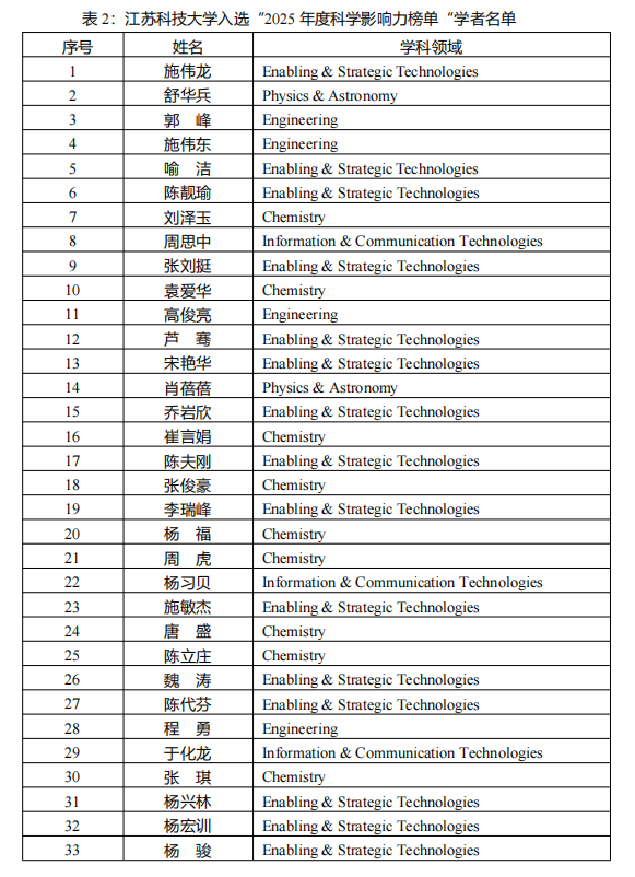 《2025全球前2%顶尖科学家榜单》数据显示,中国共有12374位学者进入“终身科学影响力排行榜”,有31685位学者入选“2025年年度影响力榜单”。其中,德赢AC米兰官网施伟东、舒华兵、施伟龙、杨习贝、郭峰、周思中、张俊豪7名学者入选“终身科学影响力榜单”(表1),较去年增加3名。同时33名学者入选“2025年度科学影响力榜单“(表2),较去年增加6名。入选人数再创新高,学校国际学术影响力进一步扩大,体现了学校学科与人才队伍建设的成效和科研工作实力。