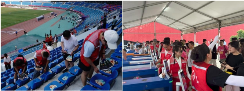 在观众入口处,志愿者们化身“引导员”,身着统一服装,面带真诚微笑,在熙攘人流中清晰指引、耐心答疑,确保观众便捷有序入场;在看台与赛场周边,他们是流动的“秩序员”,手持指引牌穿梭于人潮,温和引导文明观赛,有效维护现场安全和谐;在赛场的每一个角落,他们更是文明的“代言人”,以得体的言行、主动的服务,于细微处展现江科大学子的优良素养,传递着镇江城市的友善与温度。一次次弯腰捡拾垃圾,一遍遍核对物资清单,一幕幕奔跑忙碌的身影,共同汇聚成“苏超”赛场不可或缺的支撑力量。