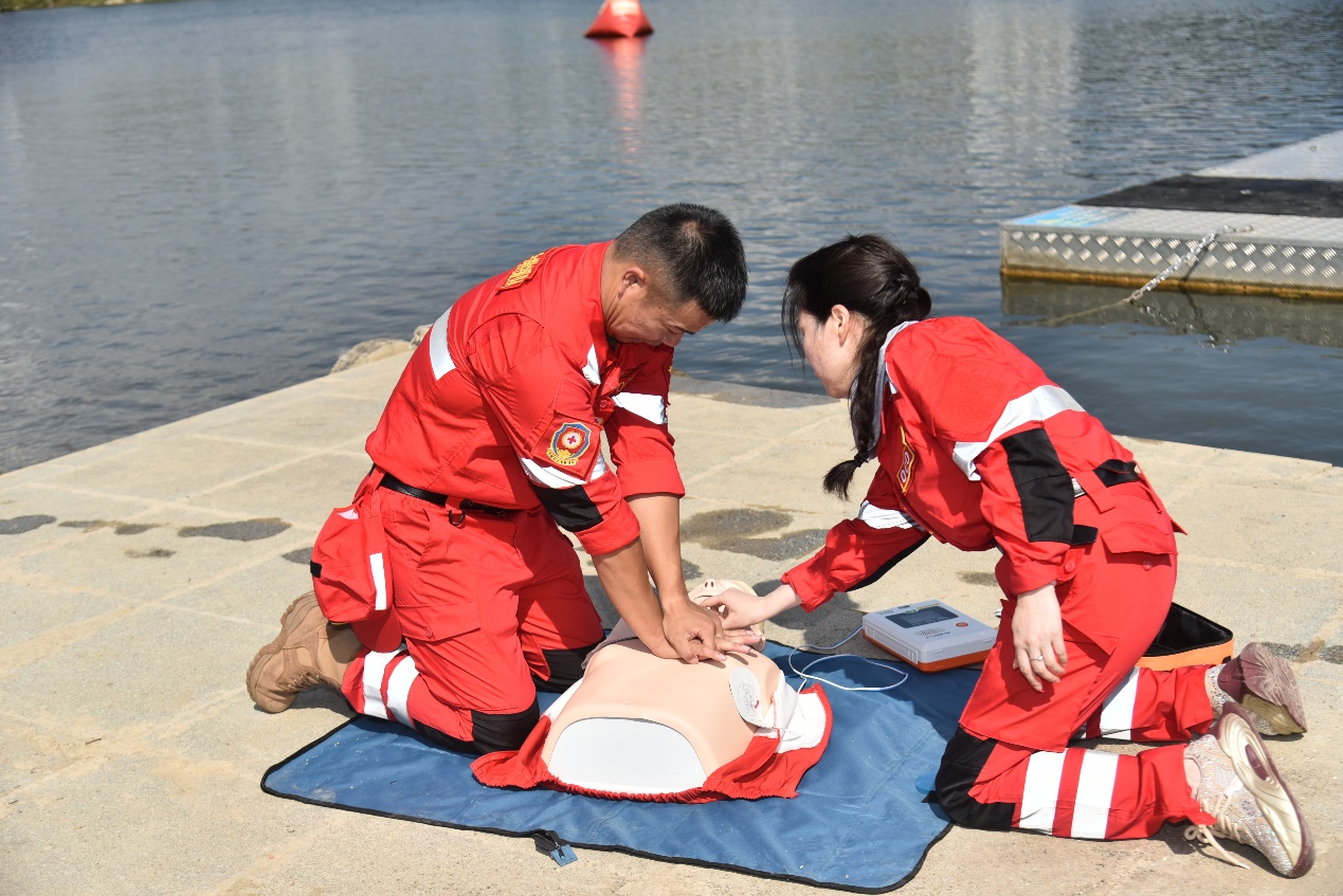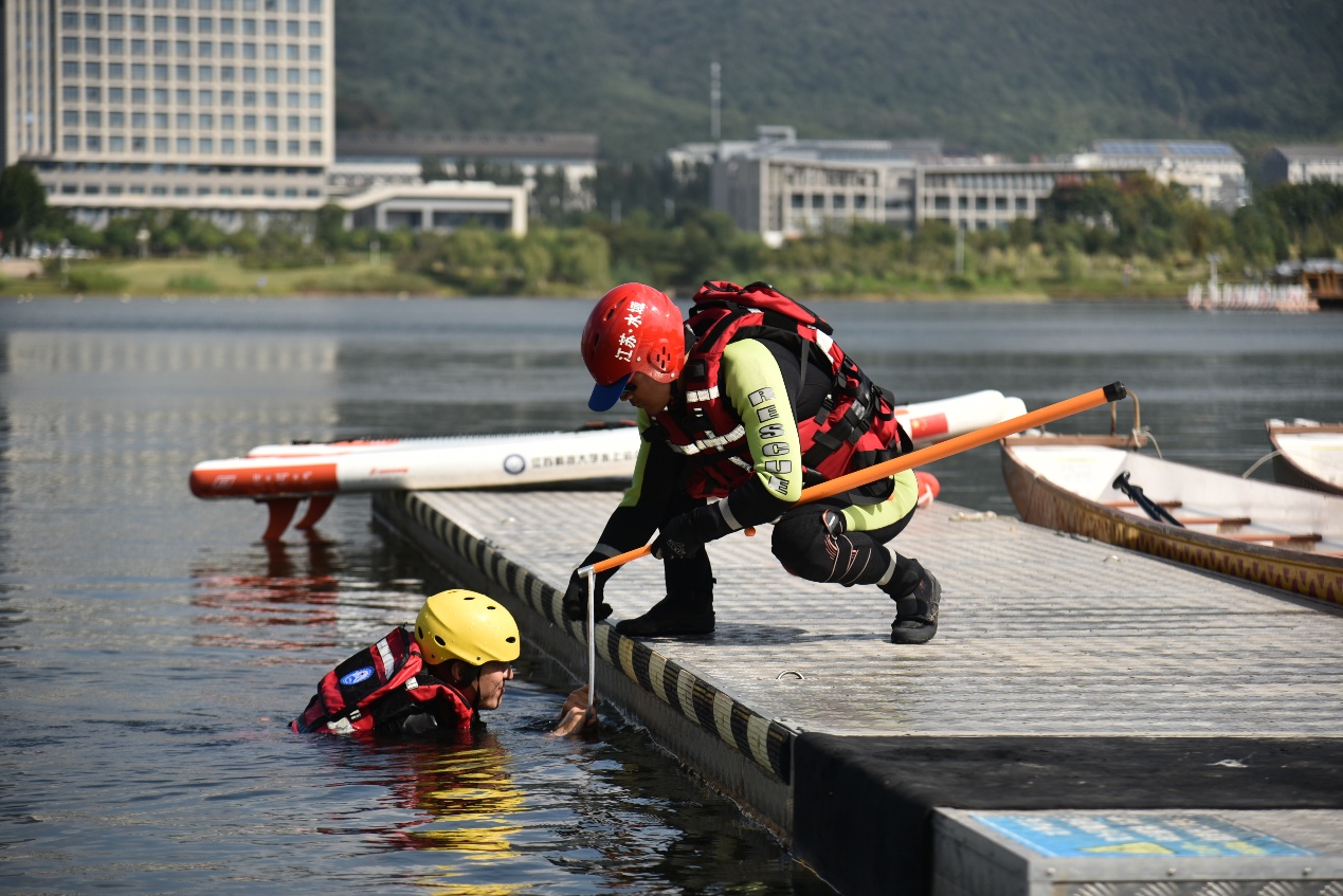仪式结束后,与会人员移步至基地演练区域,现场观摩了高水平的应急救援实战展示。江苏省红十字(镇江)水上救援队、丹徒区红十字救援队与德赢官网师生救援队伍协同开展水上应急救援演练,队员们凭借专业的救援技能、默契的配合,完成了溺水模拟救援、水上救生器材操作等多个科目,展现了过硬的应急处置能力。此外,市红十字救援队、丹徒区红十字救援队及丹徒区红十字造血干细胞志愿服务队还在现场设置宣讲台,为师生普及心肺复苏、创伤包扎、造血干细胞捐献等知识。