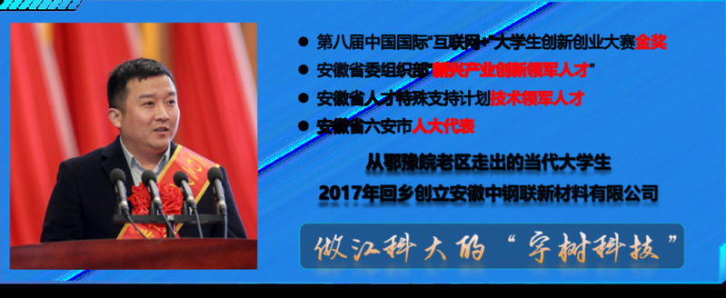 【人物简介】吕林,安徽省委组织部新兴产业创新领军人才,安徽省高层次人才;从鄂豫皖老区走出的当代大学生,获第八届中国国际”互联网+”大学生创新创业大赛金奖,回乡创立安徽中钢联新材料有限公司,德赢AC米兰官网2014届材料学院校友。