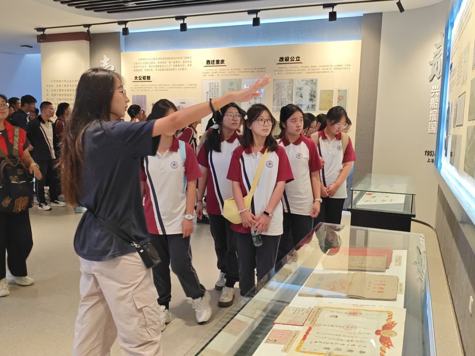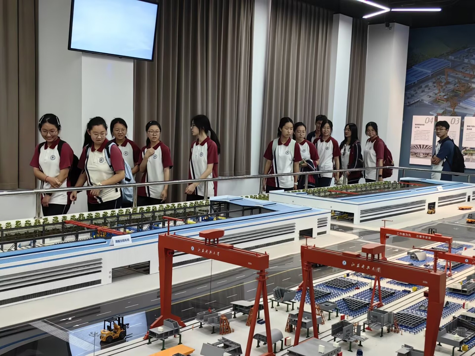 在校史馆,讲解员带领同学们依次走进校史、蚕桑、船舶和科技成果四大展厅。校史厅里,老照片与档案将江科大从“船魂”中诞生、在江海之间成长的历程娓娓道来;蚕桑厅里,缕缕丝线背后,是学校以特色服务“一带一路”的“中国方案”;船舶厅里,模型与实物并列,“兴船报国”的初心可感可触;科技成果厅里,最新专利和转化项目静静陈列,映出学校把论文写在大海与田野上的坚实脚印。一路走、一路看,同学们第一次如此近距离地感受到大学与国家战略、传统文化、前沿科技同频共振的脉搏,也体悟到江科大“兴船报国、服务海洋”的使命担当。
