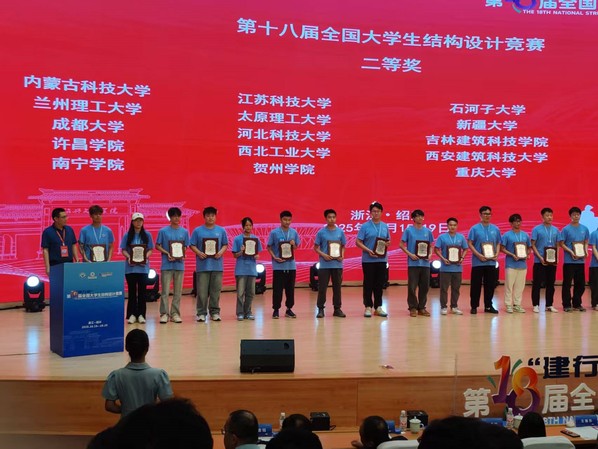 10月15日至19日,第18届“建行杯”全国大学生结构设计总决赛在绍兴文理学院举行。学校土木工程与建筑学院孙雯峻、魏顺林、魏文杰同学组成的“江科海韵”代表队与清华大学、同济大学、东南大学等来自全国119所高校的120支参赛队同台竞技,斩获第18届全国大学生结构设计竞赛二等奖(全国第49名)的好成绩,这是德赢官网继2024年第17届全国大学生结构设计竞赛后获得的又一好成绩。学校获全国大学生结构设计竞赛“优秀组织奖”。