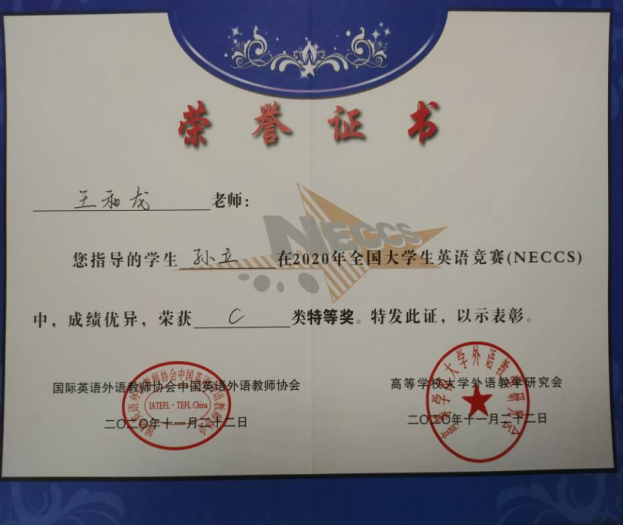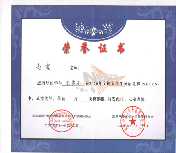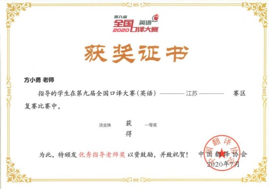 教师指导学生获“外教社杯”长三角区域高校学生跨文化能力大赛暨全国邀请赛(江苏省赛区)特等奖;2020年全国大学生英语竞赛决赛特等奖4项,其中A类一项,B类一项,C类二项,取得了历史最好成绩;2020年“外研社·国才杯”全国英语演讲比赛、阅读比赛及写作比赛三等奖各1项;亿学杯全国商务英语竞赛全国赛三等奖1项,江苏赛区特等奖1项;2人分别获第九届全国口译大赛江苏赛区复赛一等奖和二等奖;学院本科生考研率24.56%,比上一年度增长0.75%。
