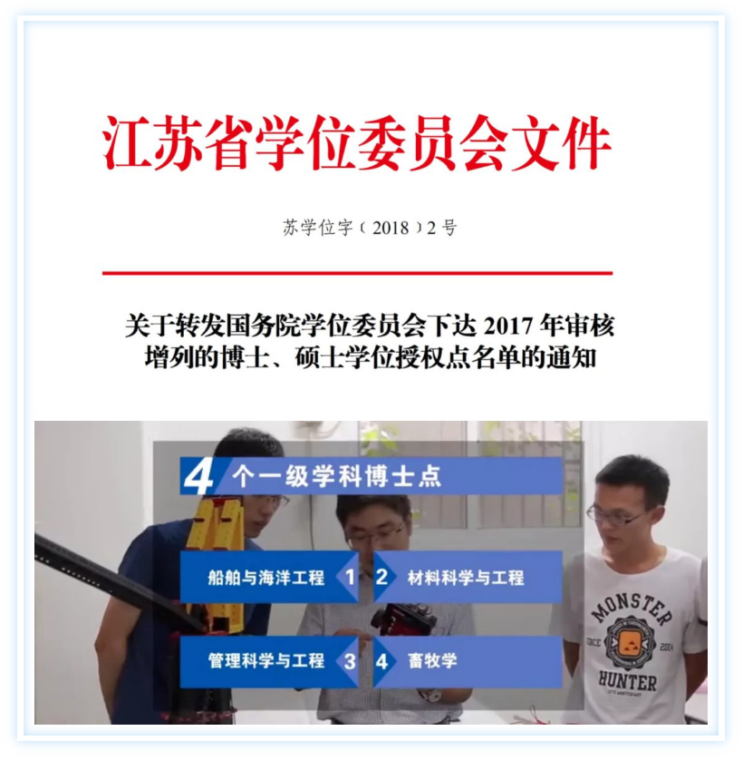 “十三五”期间,学校实施了“博士学位授权一级学科培育工程”,制定加快博士点培育的“学科特区”政策,大力培育船舶与海洋工程、畜牧学、机械工程、控制科学与工程、系统科学、冶金工程、化学工程与技术等学科,使学科水平全面达到博士学位授权一级学科点水平。