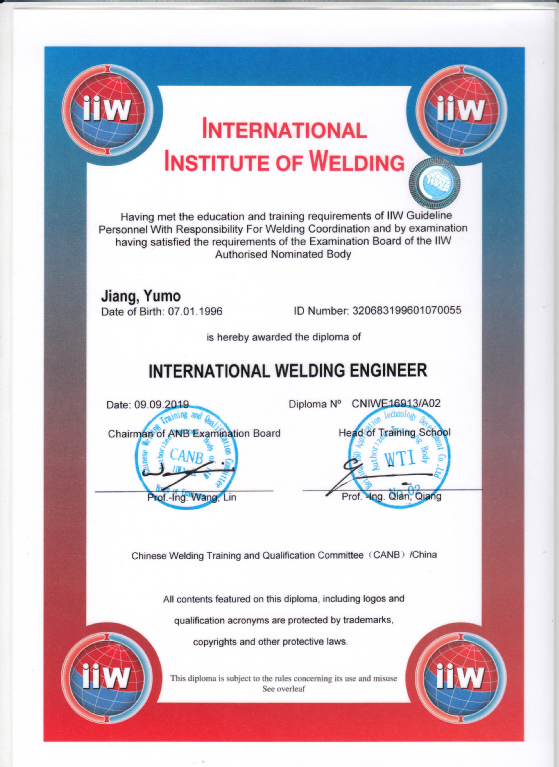 姜雨默是材料科学与工程学院2018级材料工程专业硕士研究生。研究生期间的学分绩点为4.12,位列专业第一,成功录取为哈尔滨工业大学2021级博士研究生。获评2021年度江苏省优秀毕业生,2020年研究生国家奖学金、2021届考博优秀学生学生、2019-2020优秀共青团员称号,并获得国际焊接工程师(IWE)资格认证,有着扎实的理论和实践基础。