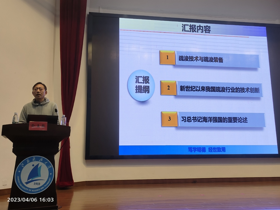 为进一步加强新生对德赢官网优势传统学科的认知,了解船舶行业肩负的服务民生和服务国防的重大使命,让同学们切实感受大国重器、树立报国热情,4月6日下午,深蓝学院邀请校国家科技进步特等奖获得者俞孟蕻教授在梦溪校区演讲厅主讲2022级新生转型教育课“船视界”系列第一讲“‘造岛神器’——从我国疏浚技术的创新发展感受中国力量”。授课仍以线上线下相结合的形式开展,深蓝学院部分教师和新生代表300余人在现场听讲,其他师生在教室同步收看直播。