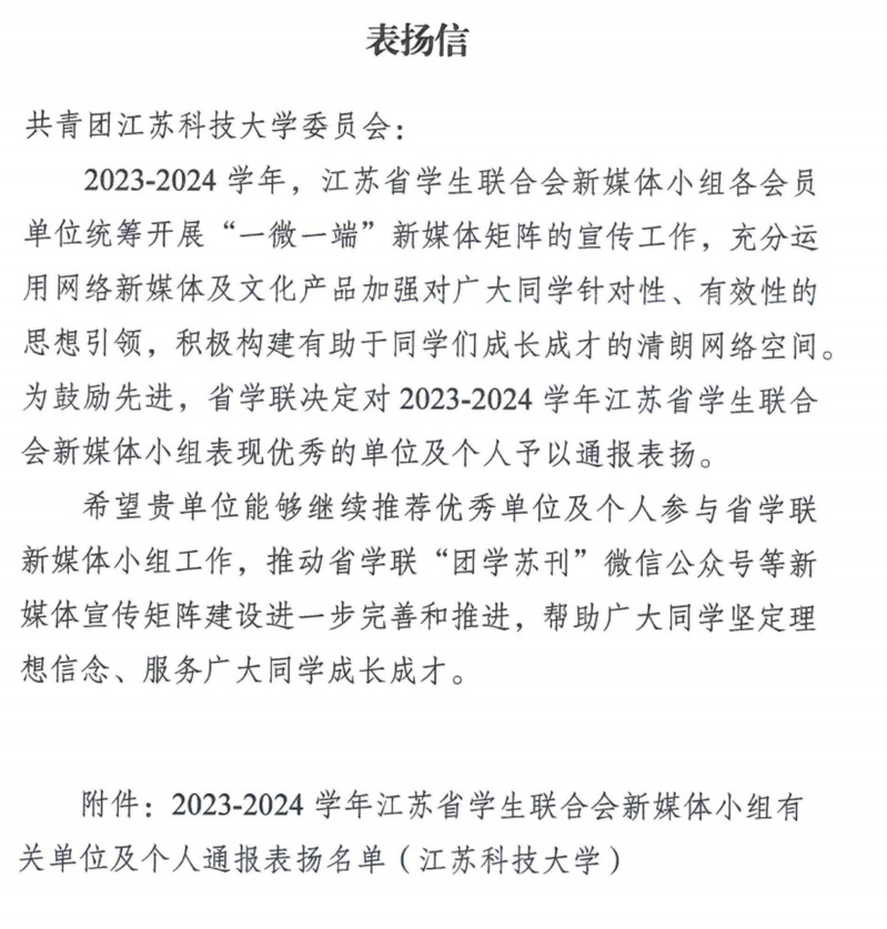 近日,德赢官网团委收到了来自江苏省学生联合会的一封表扬信,对2023-2024学年江苏省学生联合会新媒体小组表现优秀的德赢官网学生会和李佳如、朱原莹2位同学予以通报表扬。