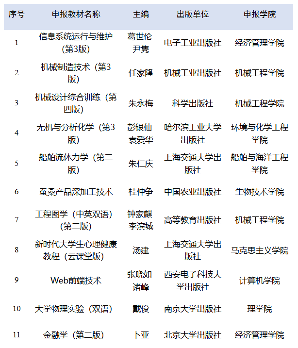 近日,江苏省教育厅公布了“十四五”普通高等教育本科省级规划教材及推荐国家级教材结果,德赢官网共有11部教材入选省级规划教材。其中,《信息系统运行与维护(第3版)》《机械制造技术(第3版)》《机械设计综合训练(第四版)》和《无机与分析化学(第3版》等4部教材被推荐申报教育部“十四五”普通高等教育本科国家级规划教材。