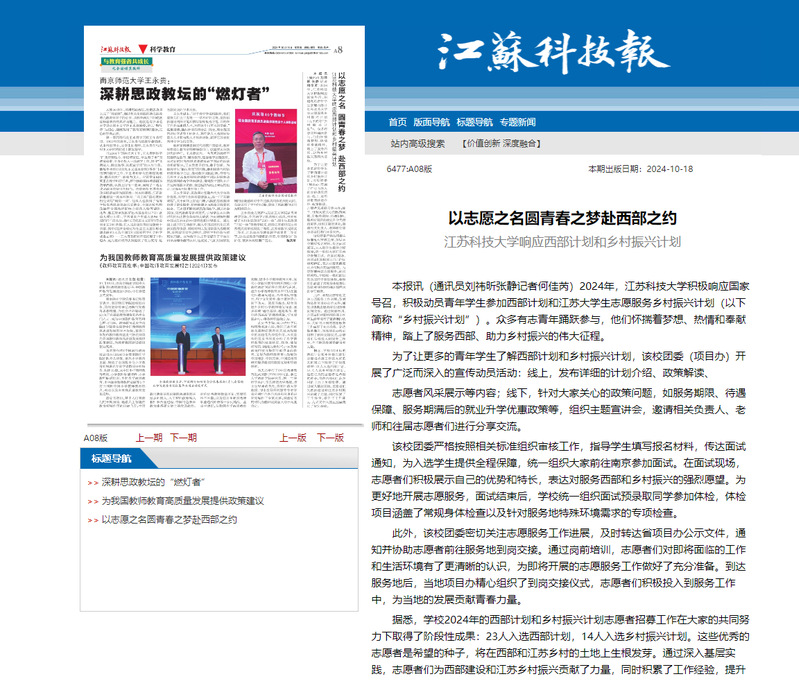 本报讯(通讯员刘祎昕张静记者何佳芮)2024年,德赢AC米兰官网积极响应国家号召,积极动员青年学生参加西部计划和江苏大学生志愿服务乡村振兴计划(以下简称“乡村振兴计划”)。众多有志青年踊跃参与,他们怀揣着梦想、热情和奉献精神,踏上了服务西部、助力乡村振兴的伟大征程。