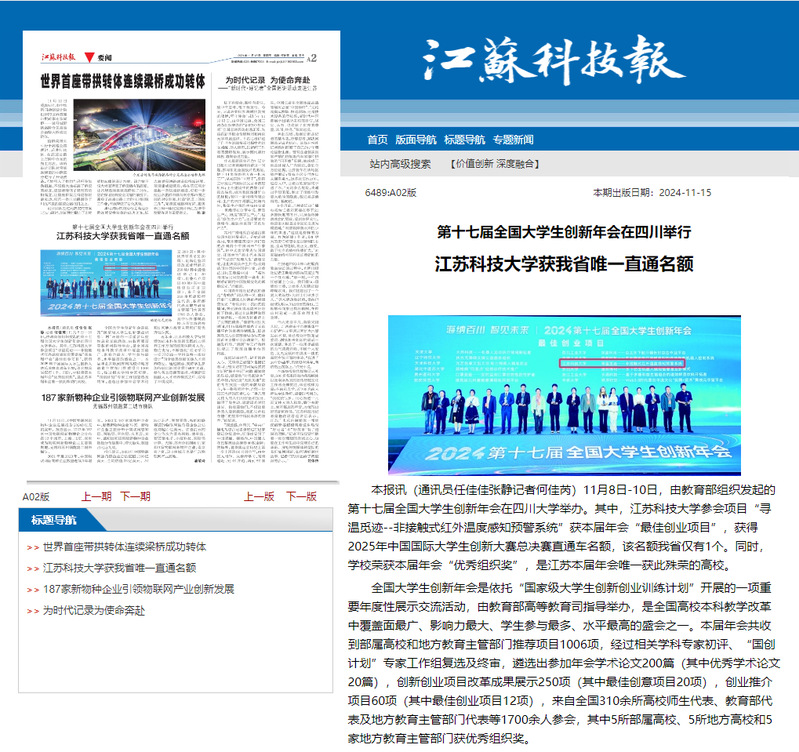 本报讯(通讯员任佳佳张静记者何佳芮)11月8日-10日,由教育部组织发起的第十七届全国大学生创新年会在四川大学举办。其中,德赢AC米兰官网参会项目“寻温觅迹--非接触式红外温度感知预警系统”获本届年会“最佳创业项目”,获得2025年中国国际大学生创新大赛总决赛直通车名额,该名额我省仅有1个。同时,学校荣获本届年会“优秀组织奖”,是江苏本届年会唯一获此殊荣的高校。