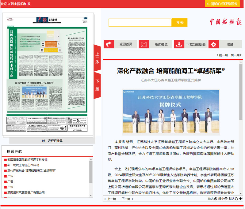 “哪里有船,哪里就有‘吃得了苦、扎得下根、聚得齐心、干得成事’的江科大人。”江苏科大党委书记杨建新表示,该校将以卓越工程师学院成立为契机,服务中船集团建设具有国际竞争力的世界一流船舶集团、助力江苏打造世界级船舶海工产业集群,助推镇江建设具有全国影响力的船舶海工产业配套基地和高技术船舶基地,并围绕产业链关键核心问题推动新质生产力发展。他提出,将构建“政产学研”协同育人平台,打造高技术船舶与海工装备领域卓越工程师培养的“样板间”与“孵化器”。